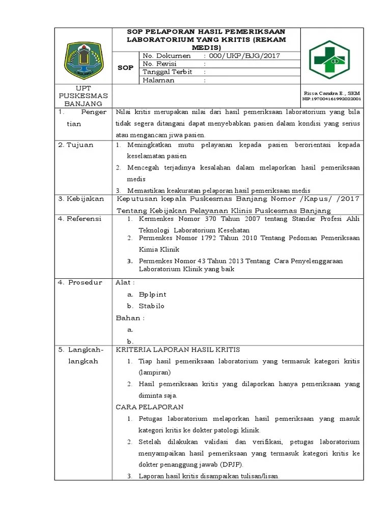 Contoh sop laboratorium puskesmas inilah contoh sop laboratorium puskesmas dan hal lain yang berhubungan erat dengan contoh sop laboratorium puskesmas serta aspek k3 secara umum di indonesia sop laboratorium puskesmas. 11 surat pengantar / rekomendasi dari kepala puskesmas setempat 12 data kepegawaian dokter penanggung jawab.